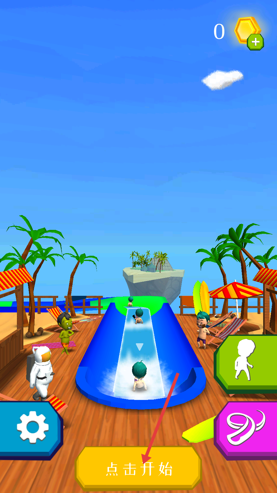1、在沙滩场景点击【点击开始】,操控角色进入水滑梯,开启竞速挑战。