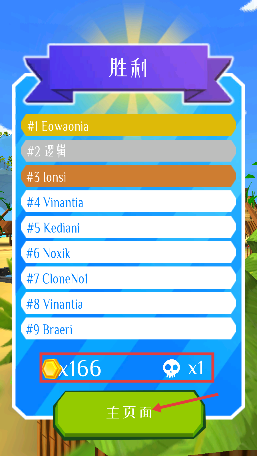 4、胜利后查看【金币-x166】【骷髅-x1】结算,点击【主页面】返回,筹备后续关卡。