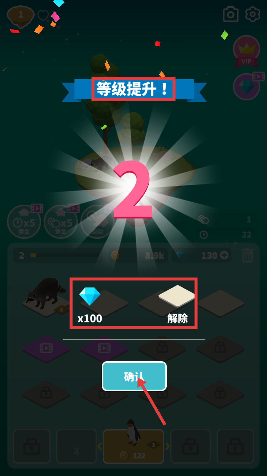 4、等级提升至【2】级,获取【x100-钻石】和格子【解除】权限,点【确认】解锁新养成空间。