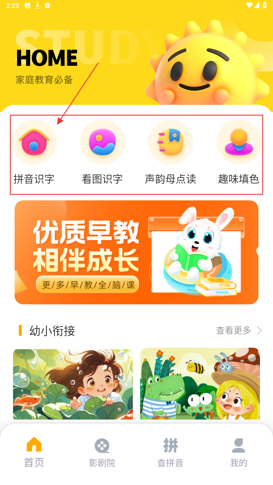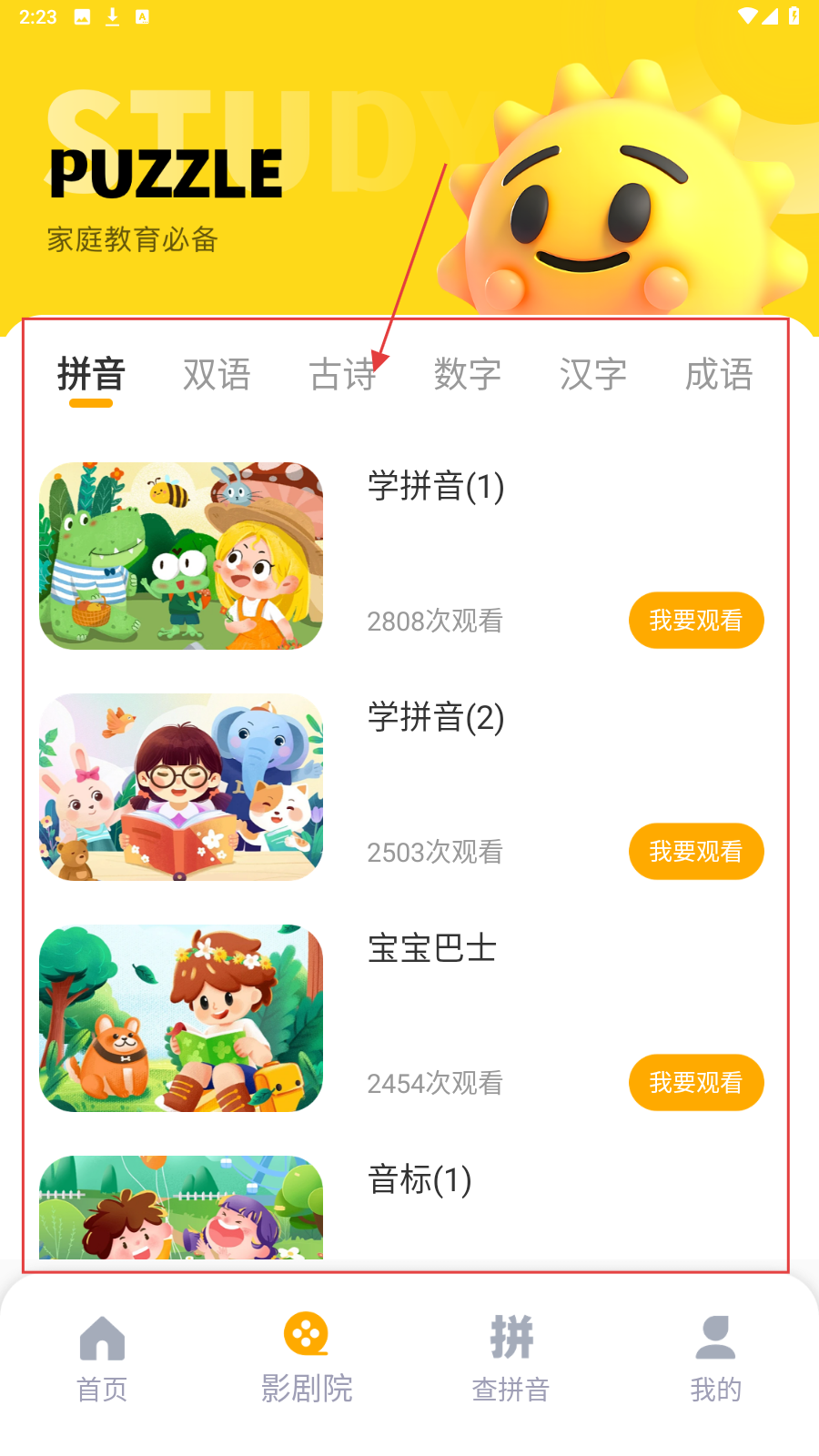 4、切换【影剧院】,选拼音课程如【学拼音(1)】,看视频巩固。