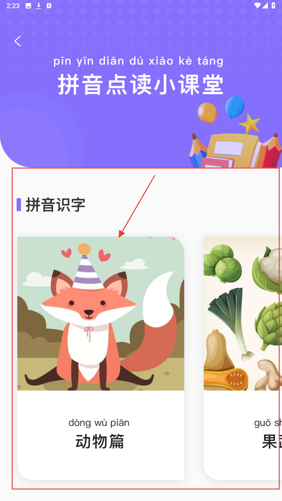 2、在拼音点读课堂,点【动物篇】卡片,借助插画学对应拼音。