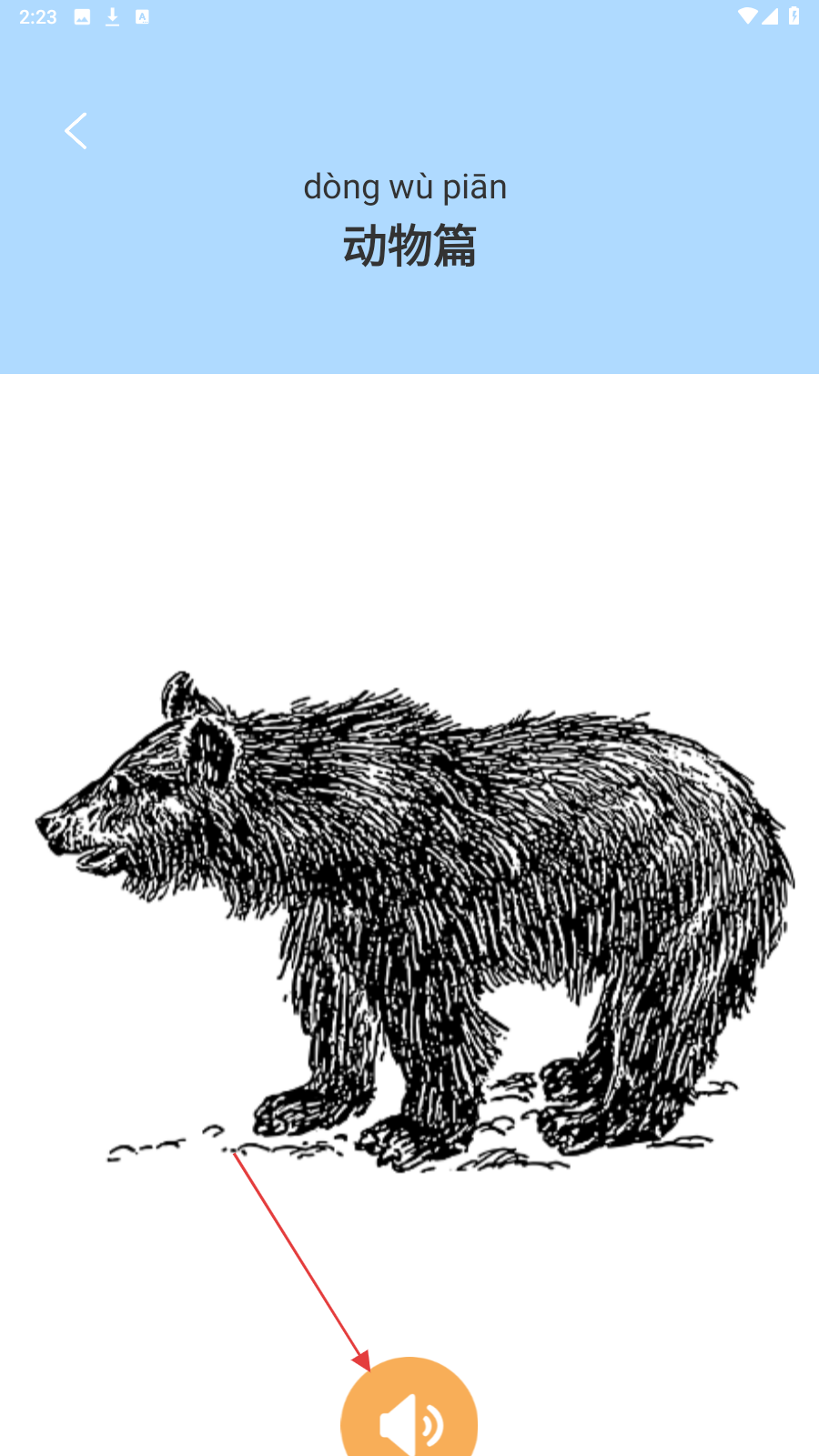3、进入动物篇详情,点底部喇叭,听发音记汉字读音。