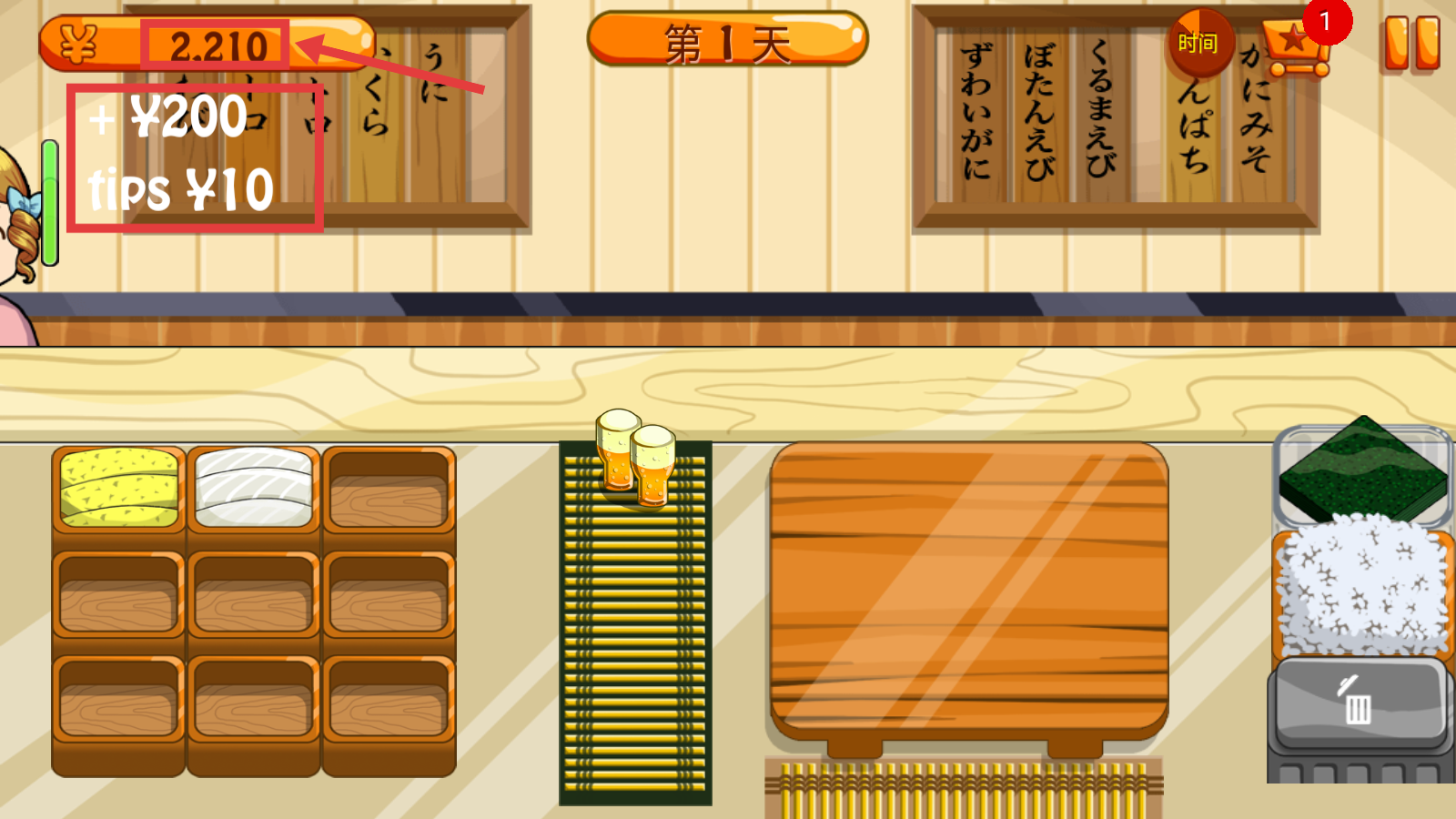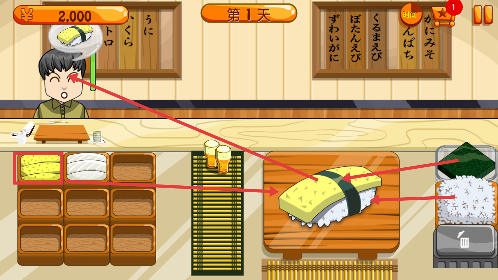 2、留意顾客头顶【寿司需求图标】,明确订单后从下方食材区挑选对应原料,为制作做准备。