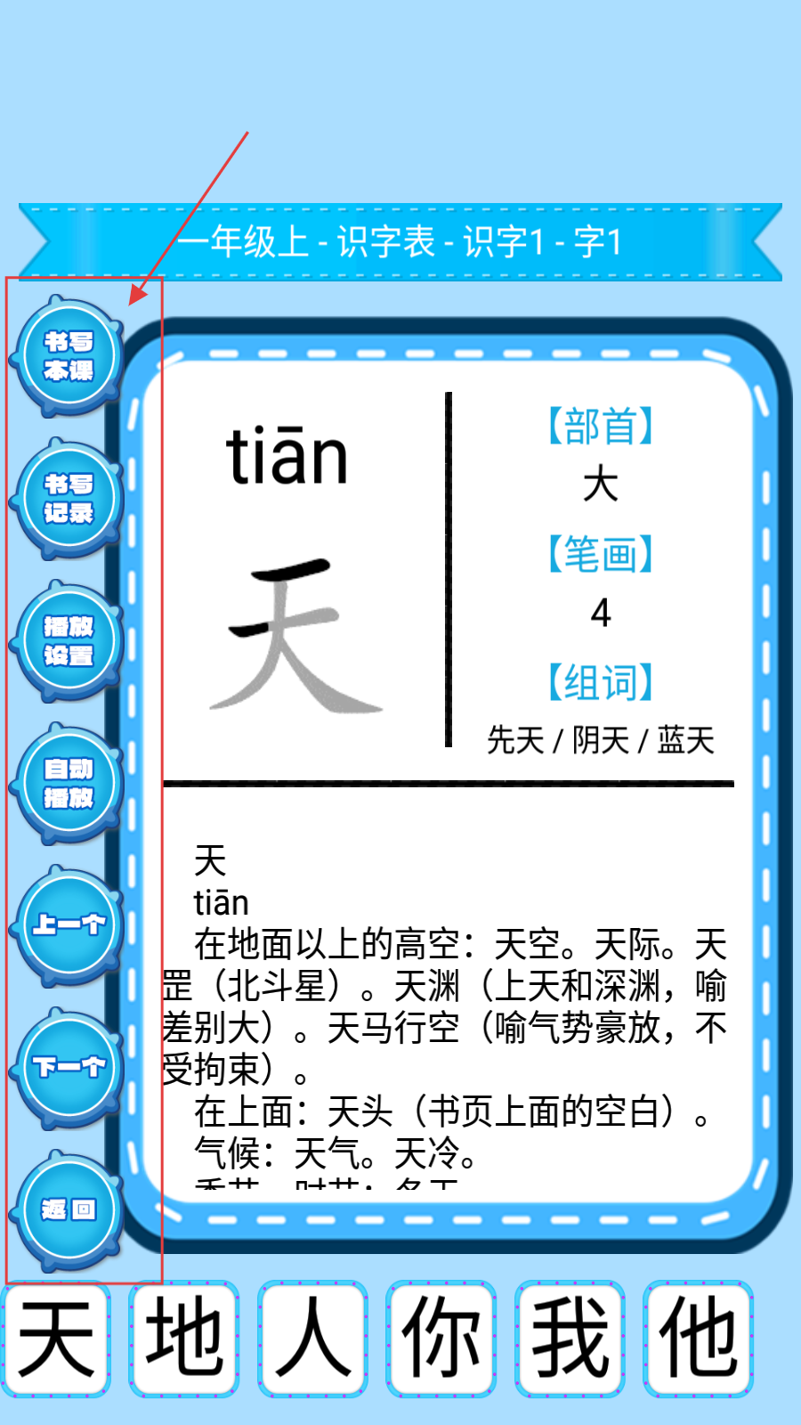 2、在【一年级上-识字表】,点【天】【地】等生字卡片,学习拼音与字形。