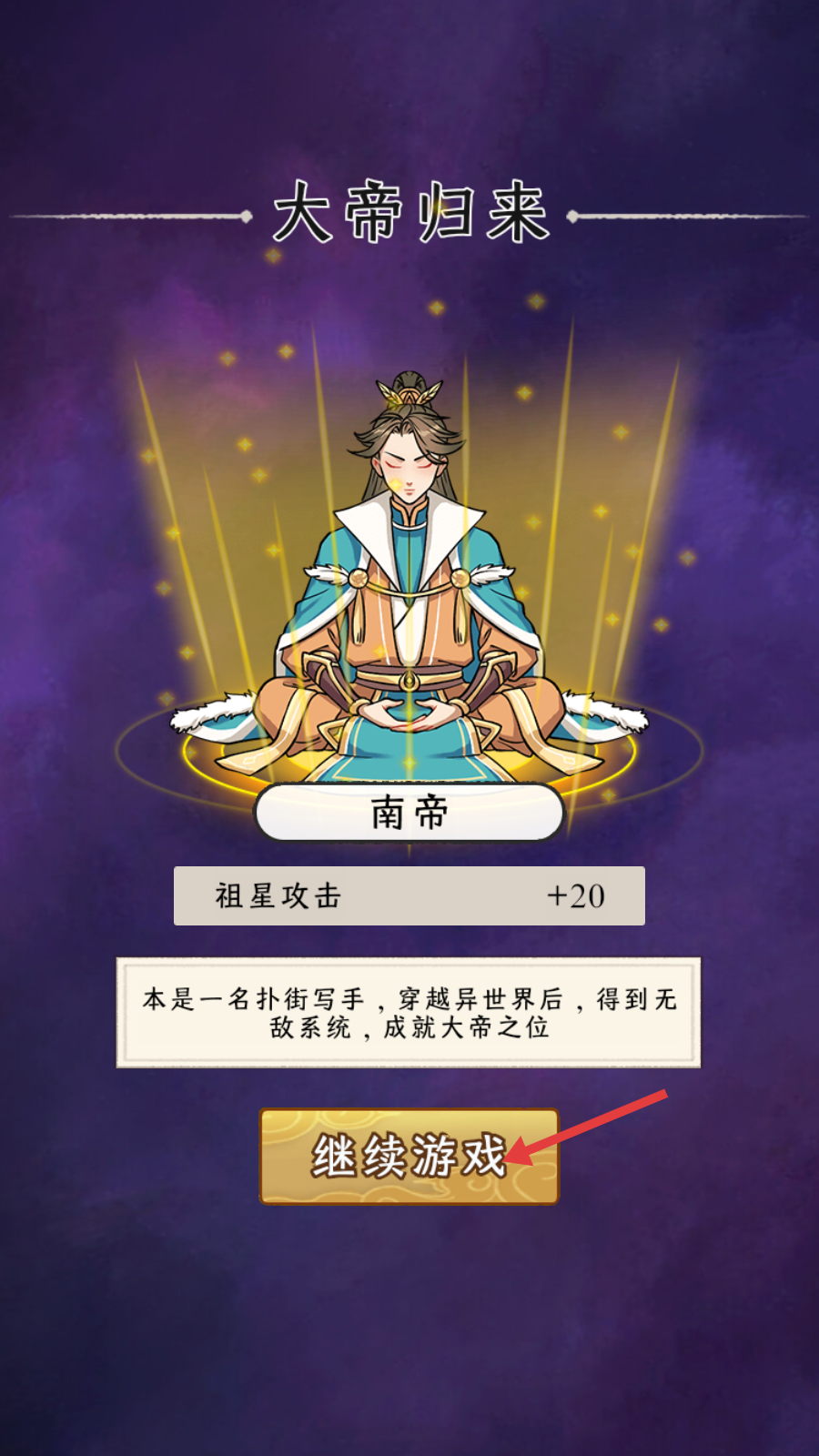 1、点击【继续游戏】开启冒险,角色【南帝】携【无敌系统】登场,初始【祖星攻击-+20】助力战斗。