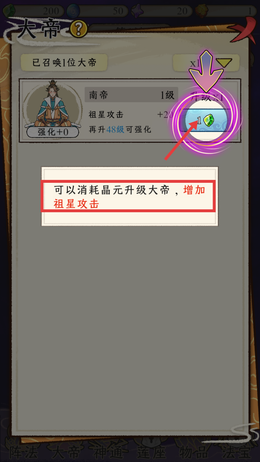 2、消耗晶元升级【南帝】,提升【祖星攻击】属性,强化大帝战力,为后续挑战积累优势。