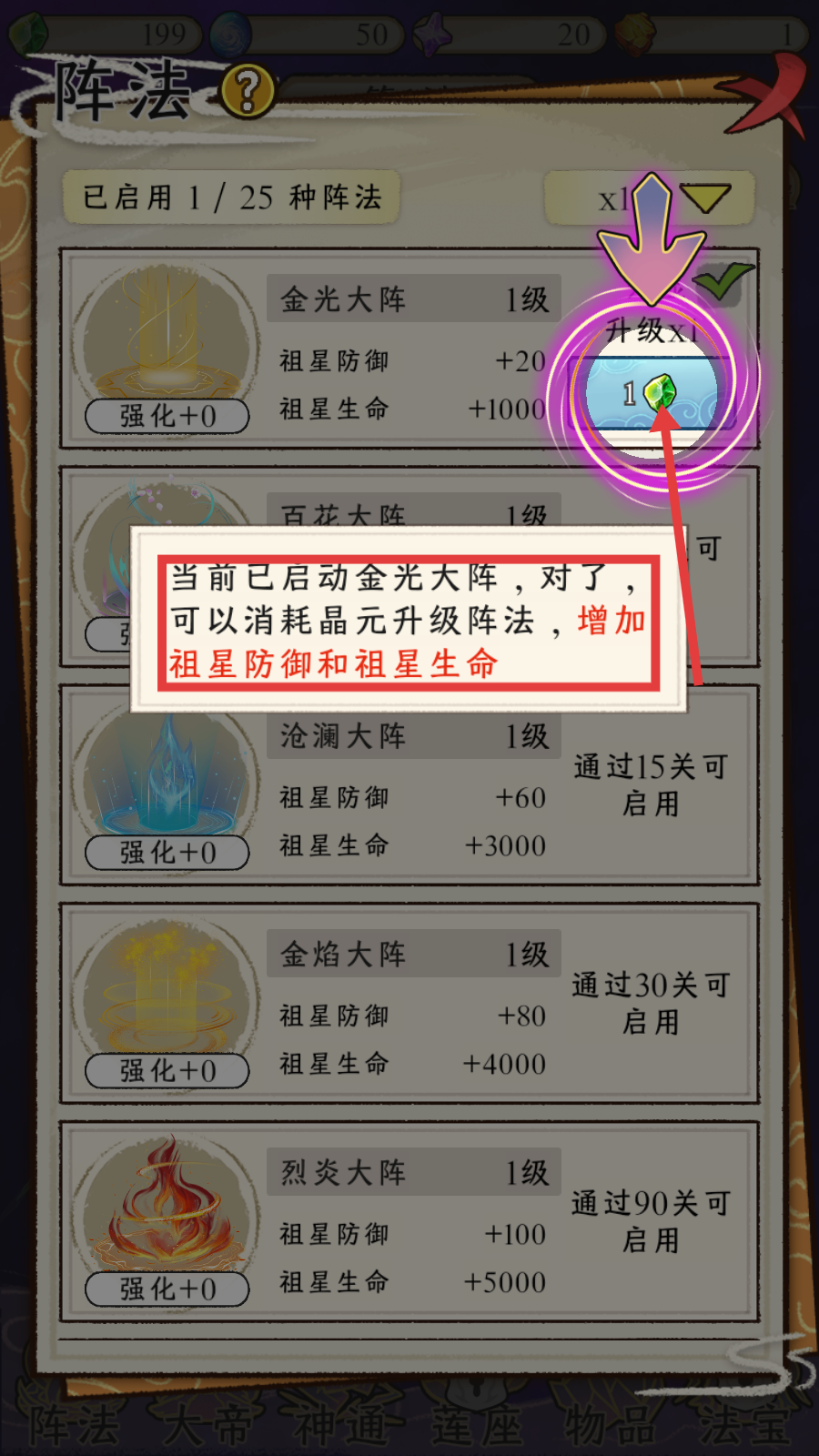 3、消耗晶元升级【金光大阵】,增加【祖星防御-祖星生命】,激活阵法提升生存续航能力。