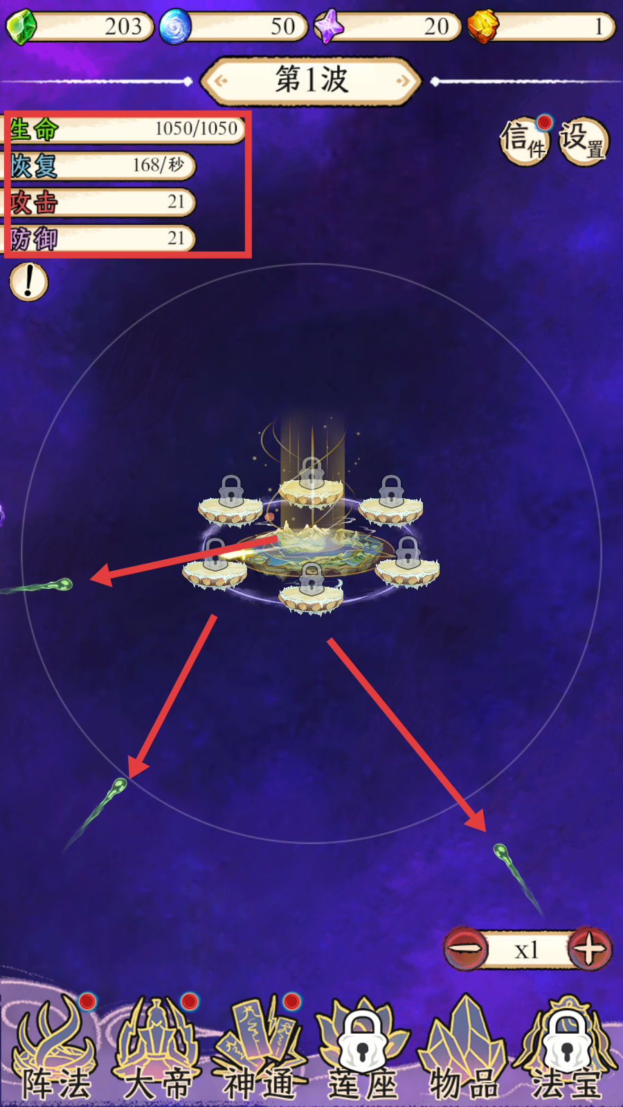 4、战前查看【生命-1050/1050】【攻击-21】等属性,应对第1波怪物,依据数值规划防御策略。