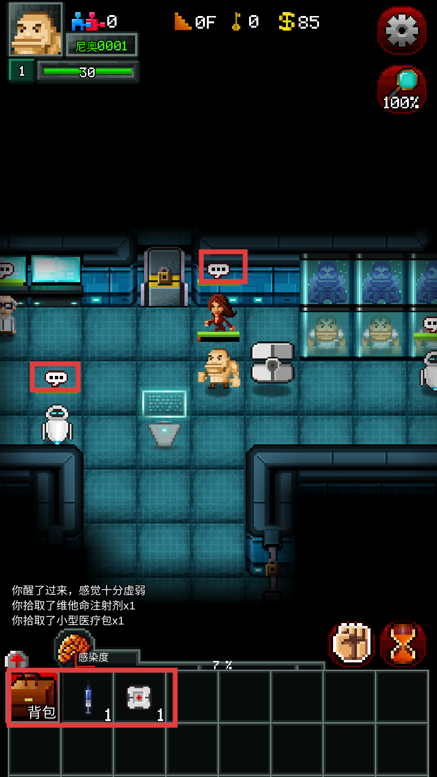 3、查看【背包-注射器×1-小型医疗包×1】,与带对话标识的NPC交互,获取任务或增益信息。