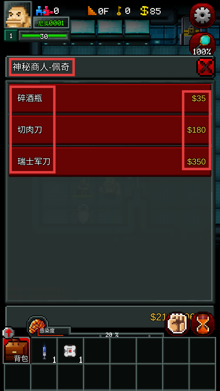 4、访问【神秘商人-佩奇】,根据金币选【碎酒瓶-$35】等武器,提升战斗能力应对敌人。