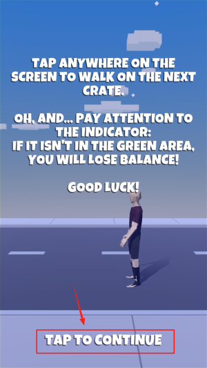 3、跳跃平衡:在“TAP ANYWHERE ON THE SCREEN TO WALK ON THE NEXT CRATE...”界面,点击屏幕让角色跳到下一箱。