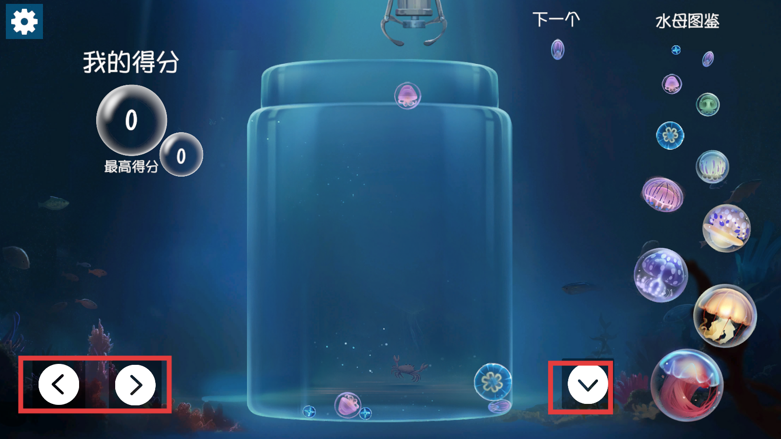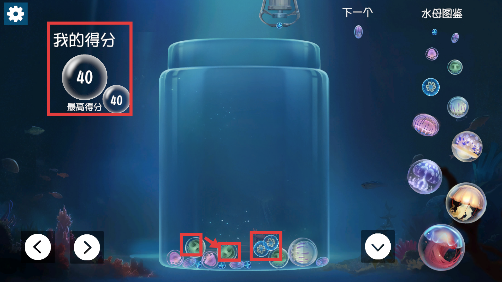 3、拖动罐内相同水母(如绿色-蓝色)合成升级,提升【我的得分-最高得分】,突破初始40分。