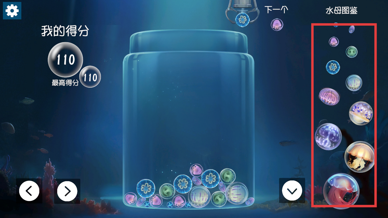 1、基础控制操作:通过按键控制水母左右移动位置,点击下落按钮精准放置,避免随机堆积。