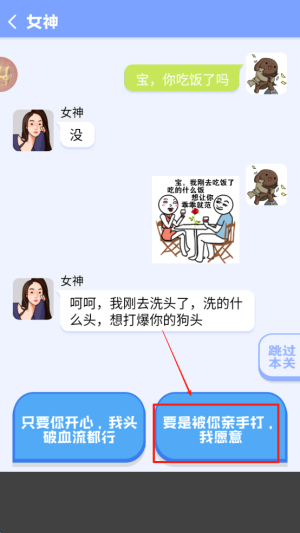 3、选择回答:在对话中选择最佳回复,点击“要是被你亲手打,我愿意”进行互动。
