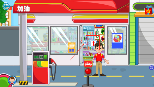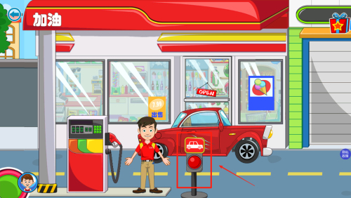 3、学习加油:在加油站场景中,拖动油枪到汽车上进行加油操作。