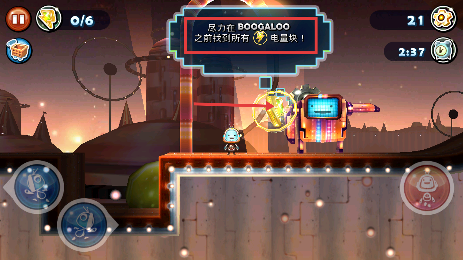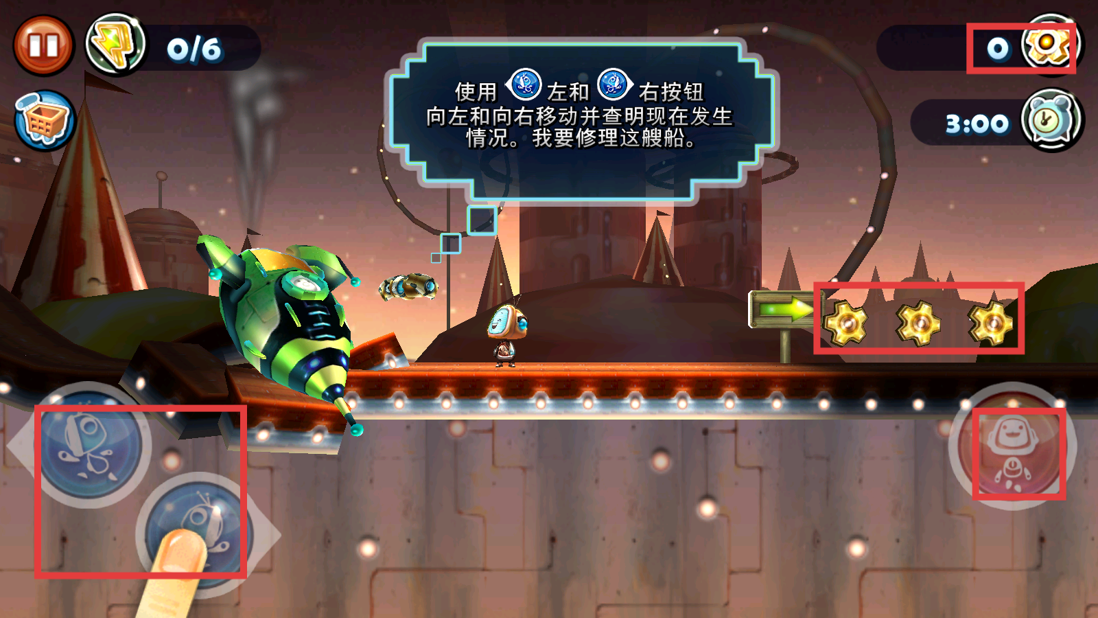2、操控左侧【移动按钮】,向右探索场景,收集右侧【金色齿轮】(目标6个),关注右上角【电量】与【时间】。