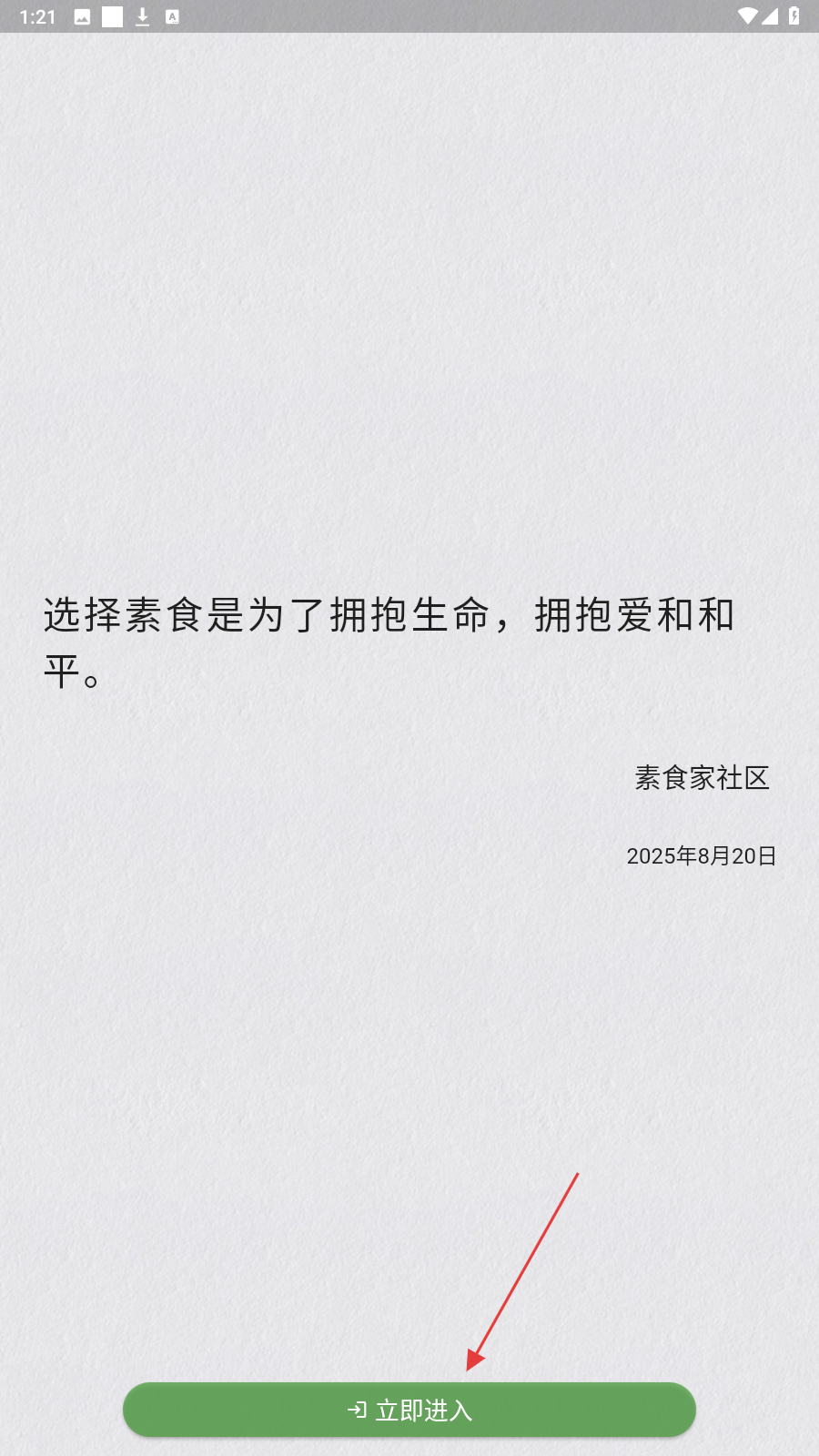 1、打开应用点【立即进入】,进入素食家社区,开启素食探索之旅。
