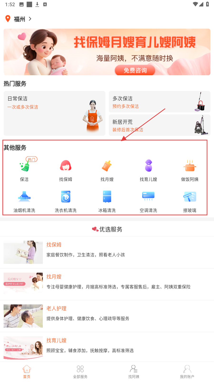 1、进入平台首页,选【找保姆】等服务,进入对应分类找阿姨。