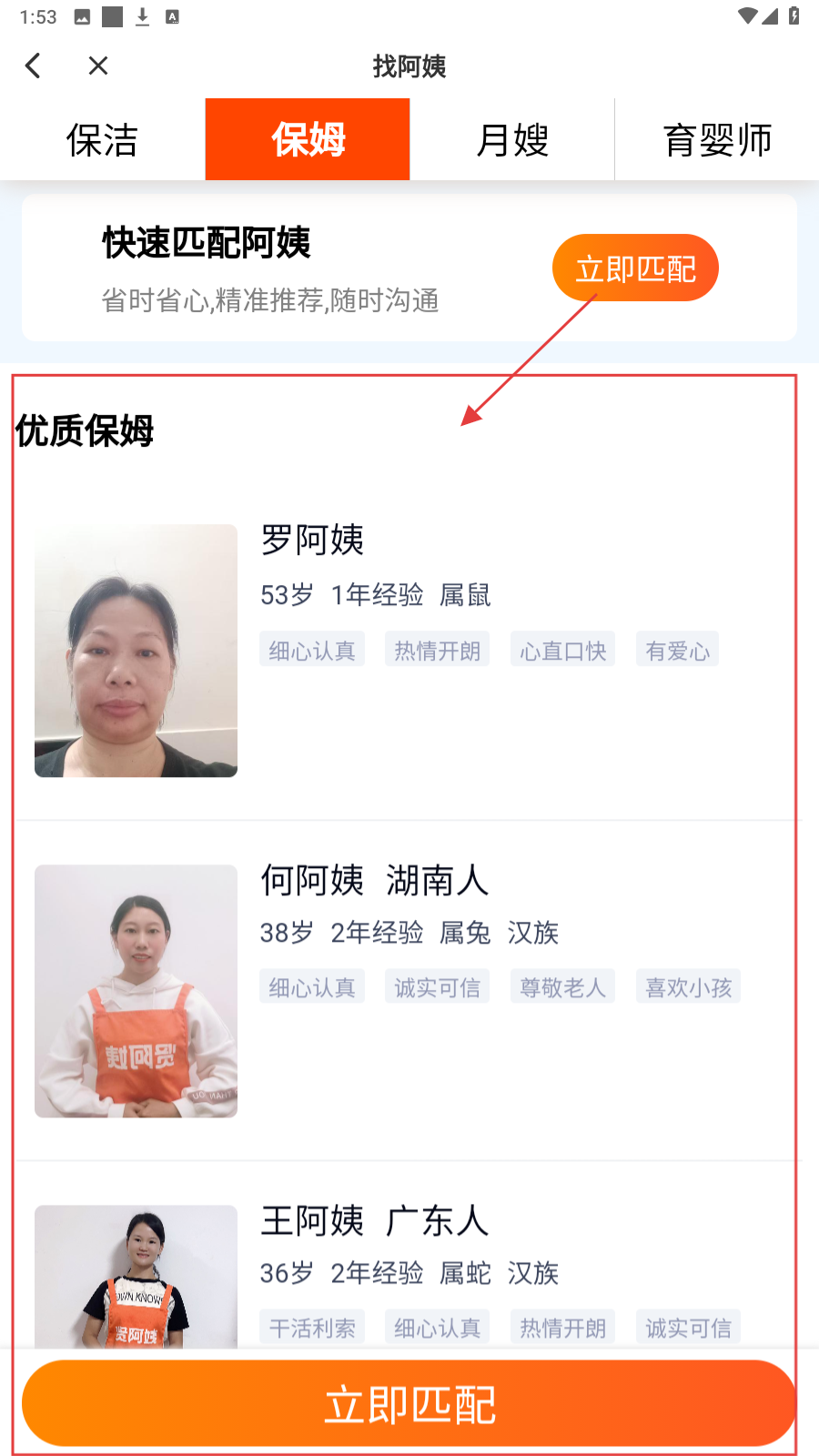 2、在【优质保姆】列表,选心仪阿姨,如罗阿姨,查看详情。