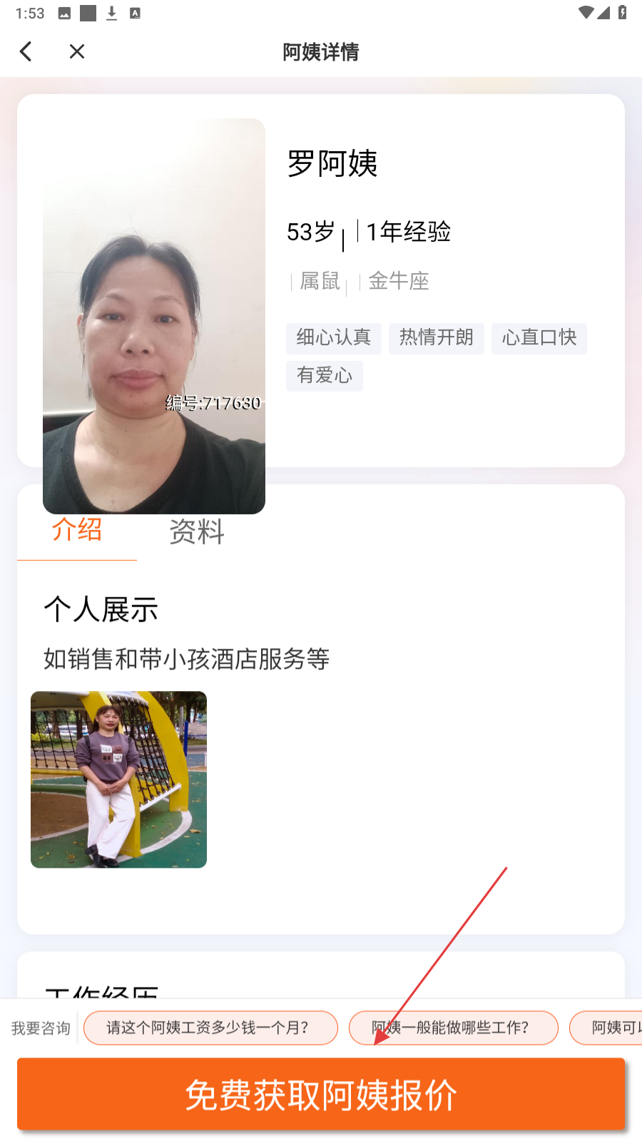 3、在阿姨详情页,点【免费获取阿姨报价】,了解服务价格。