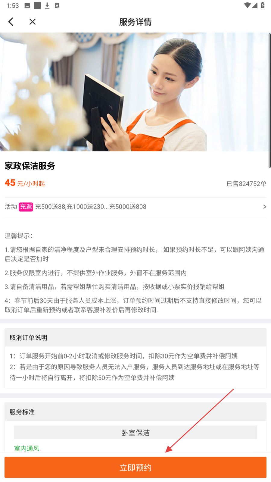 4、还可以进入保洁页面,点【立即预约】,进行家政服务预约。