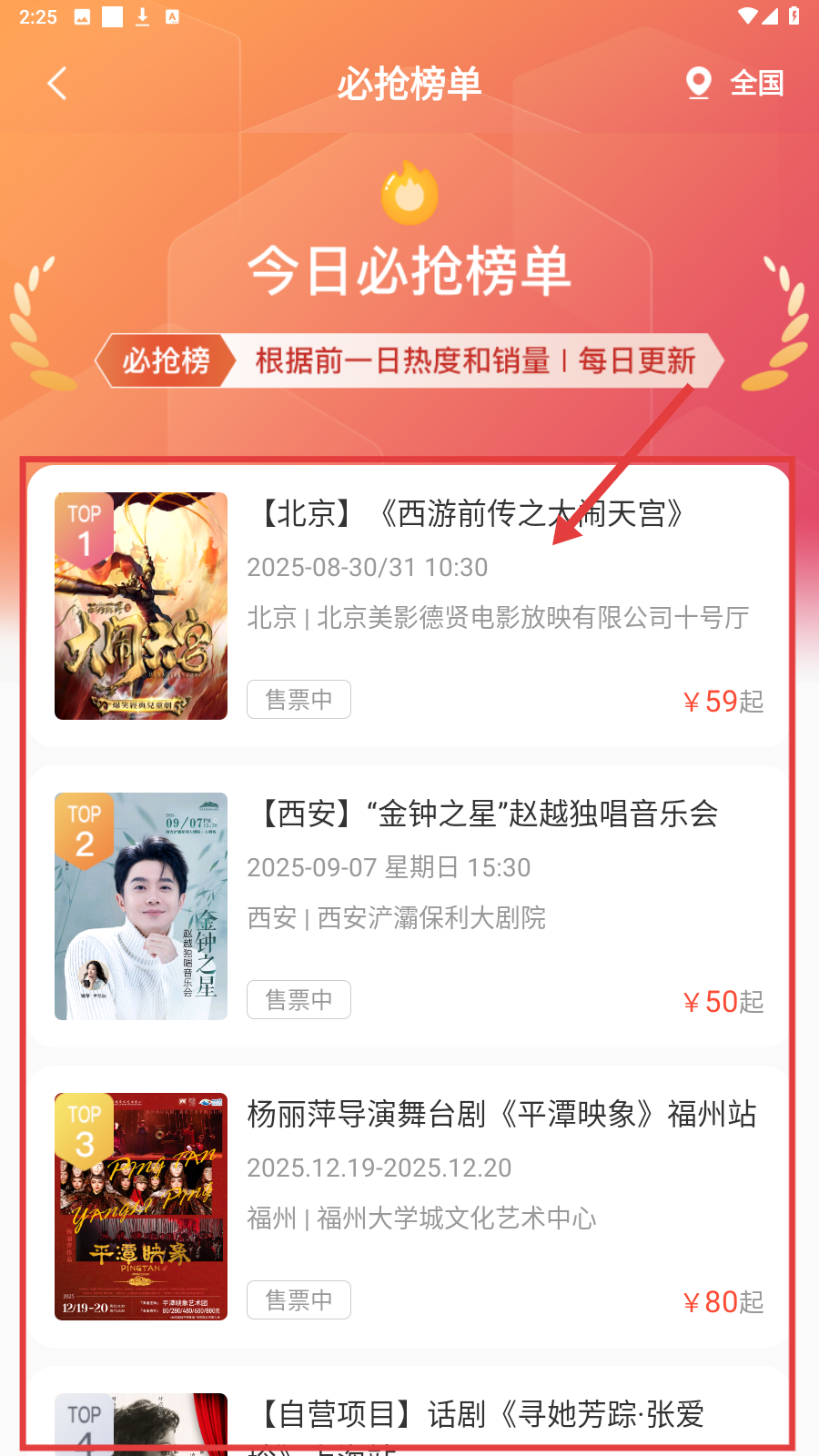 2、在必抢榜单,选心仪演出(如【北京】《西游前传之大闹天宫》),查看详情。