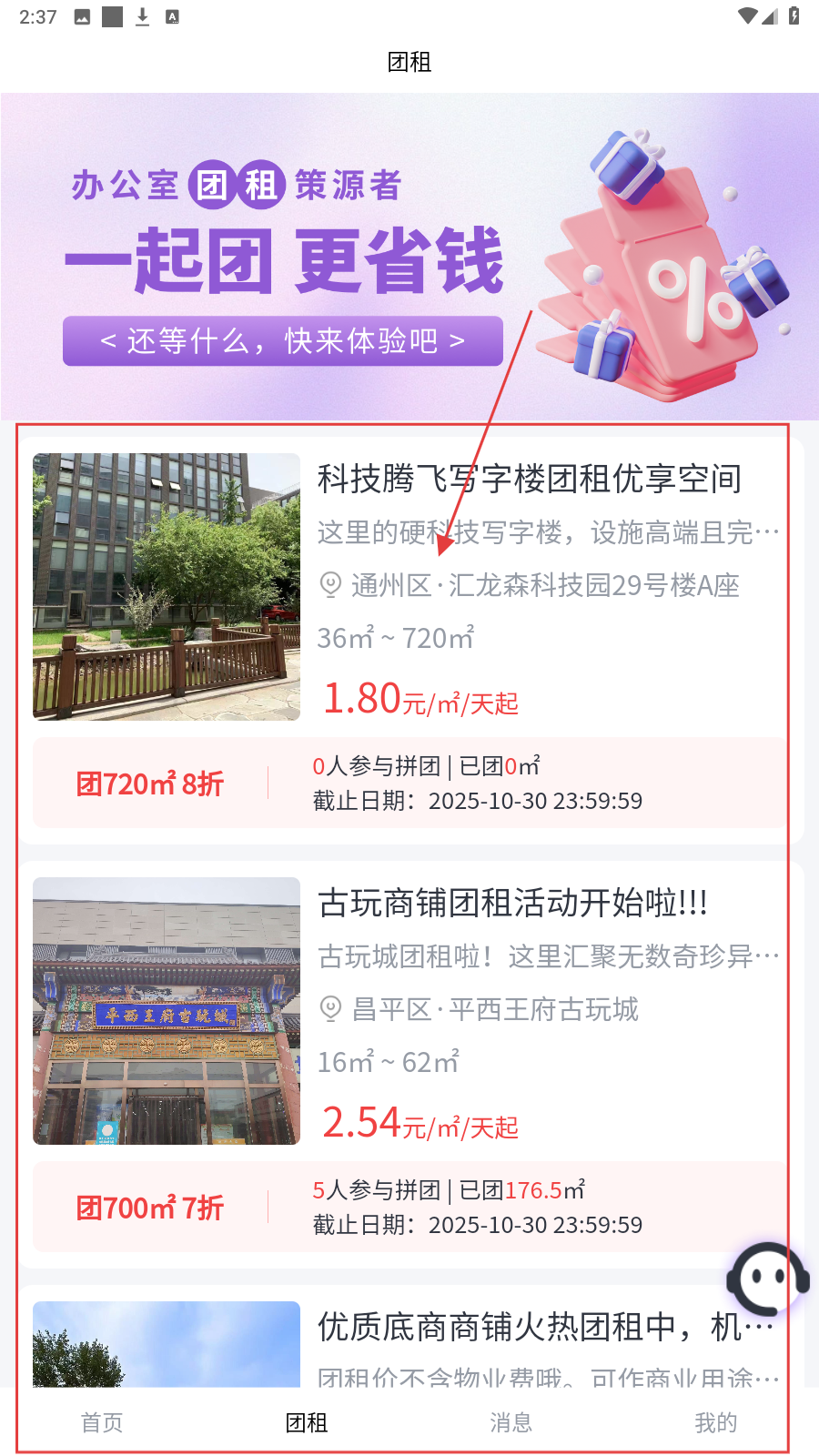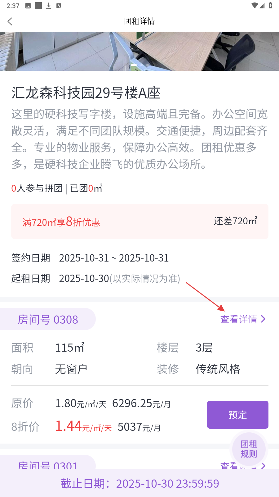 1、进入团租页,选心仪房源(如【科技腾飞写字楼】),查看基础信息。