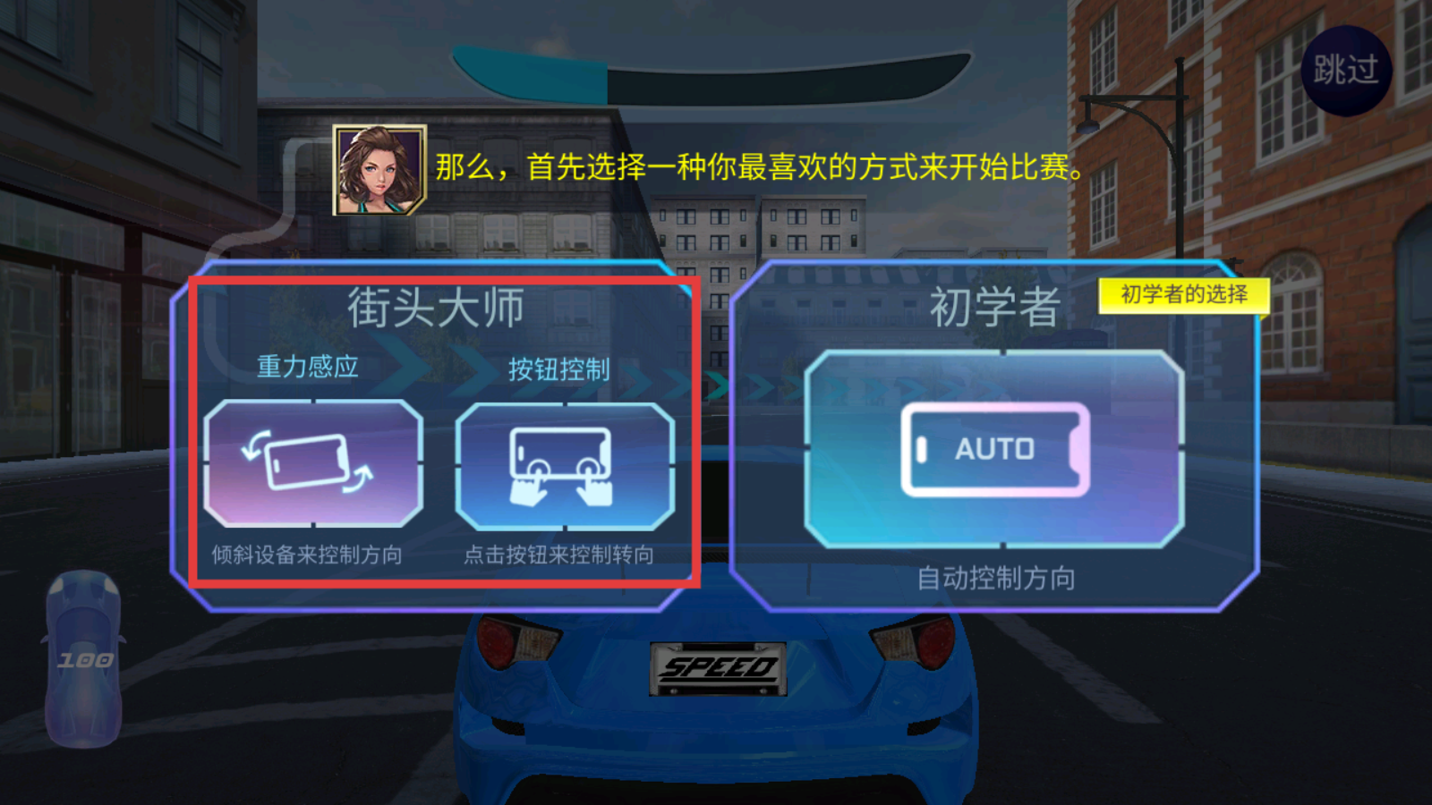 1、开局选操作模式,新手可择【初学者-AUTO】轻松起步,进阶尝试【街头大师-重力感应/按钮控制】练手。