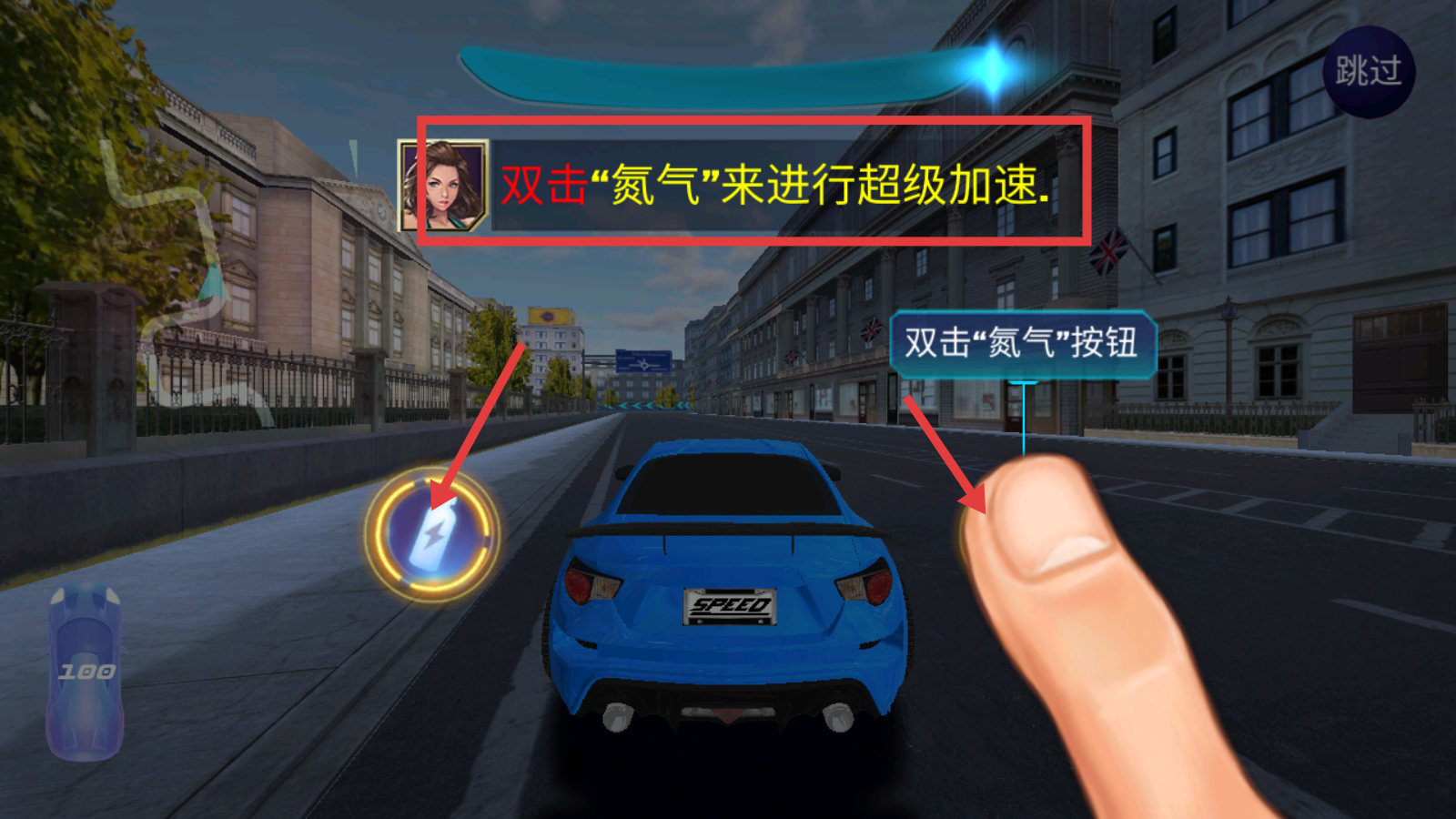 3、比赛中双击【氮气】按钮,触发超级加速,把握时机运用该操作实现弯道超车。