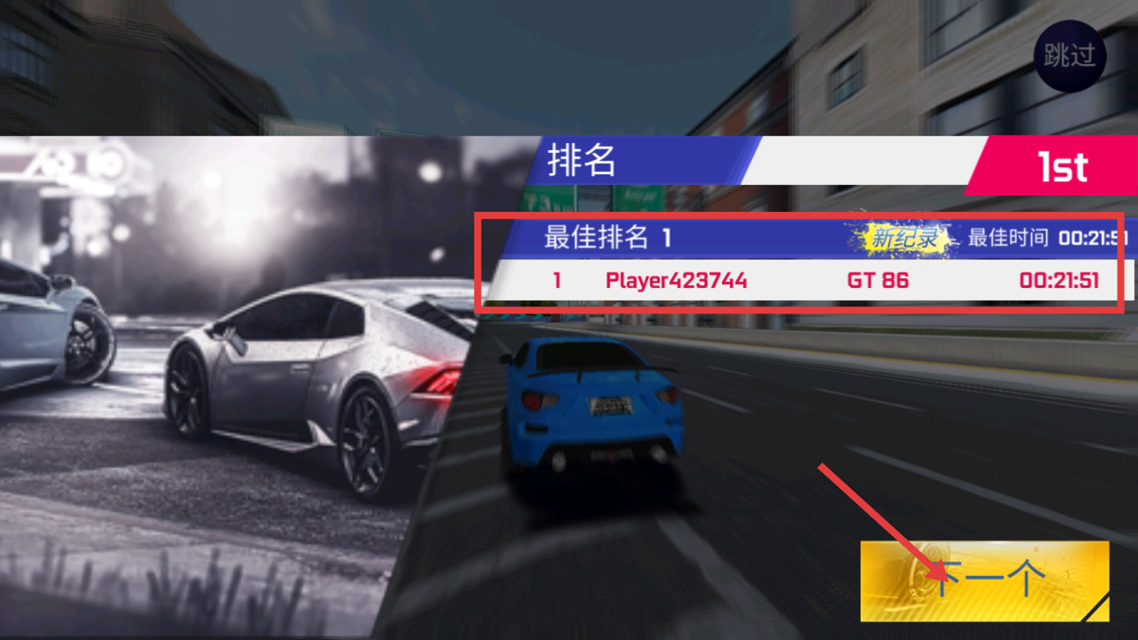 4、赛事结束查看【最佳排名-1】与【最佳时间-00:21:51】,点击【下一个】开启新挑战。