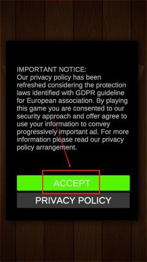 1、在游戏启动界面,阅读隐私政策更新并点击“ACCEPT”按钮,以同意政策并继续游戏。