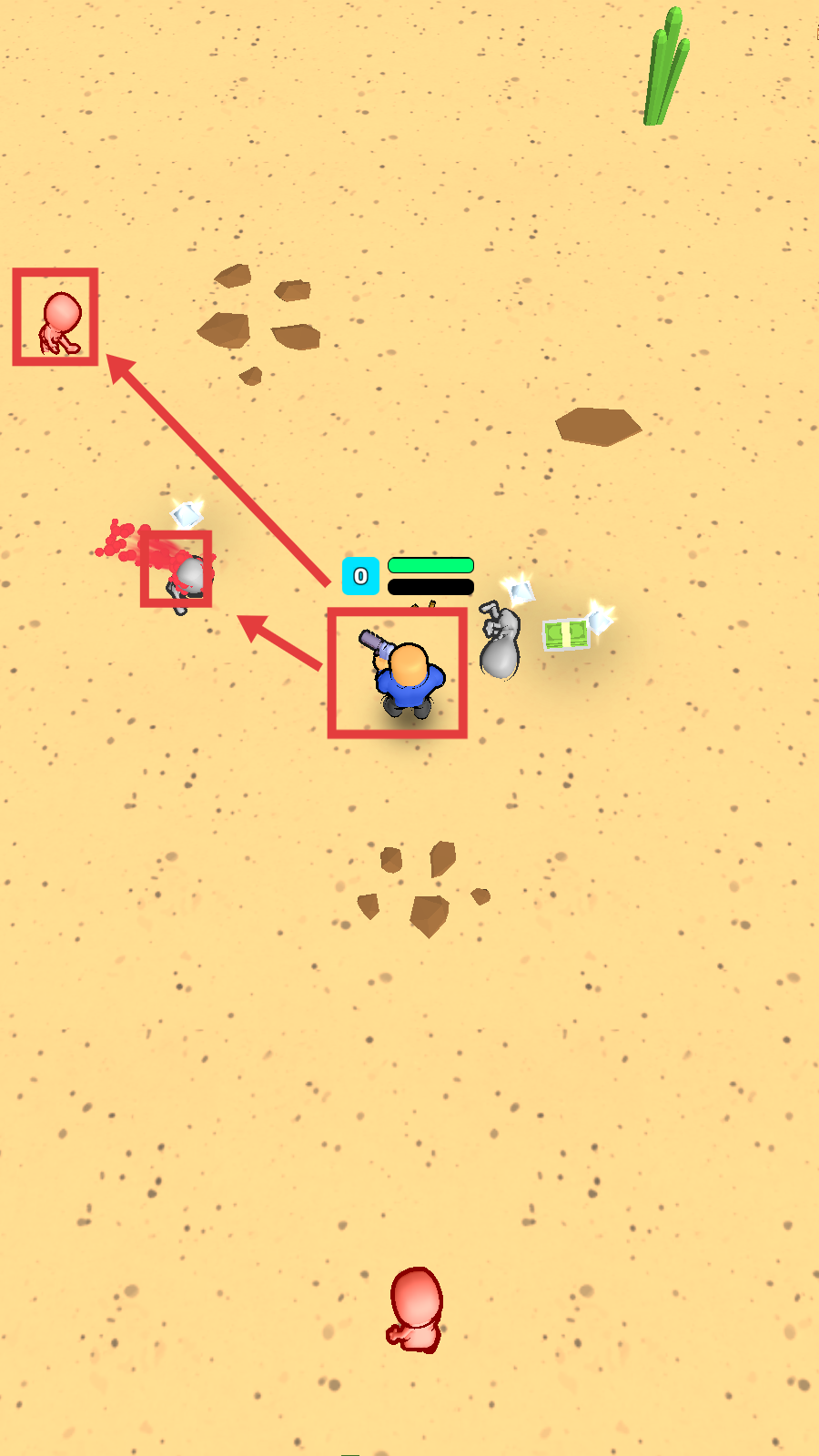 2、战斗中瞄准红色敌人射击,拾取掉落道具,留意周边敌人动向,维持生存并推进战局。