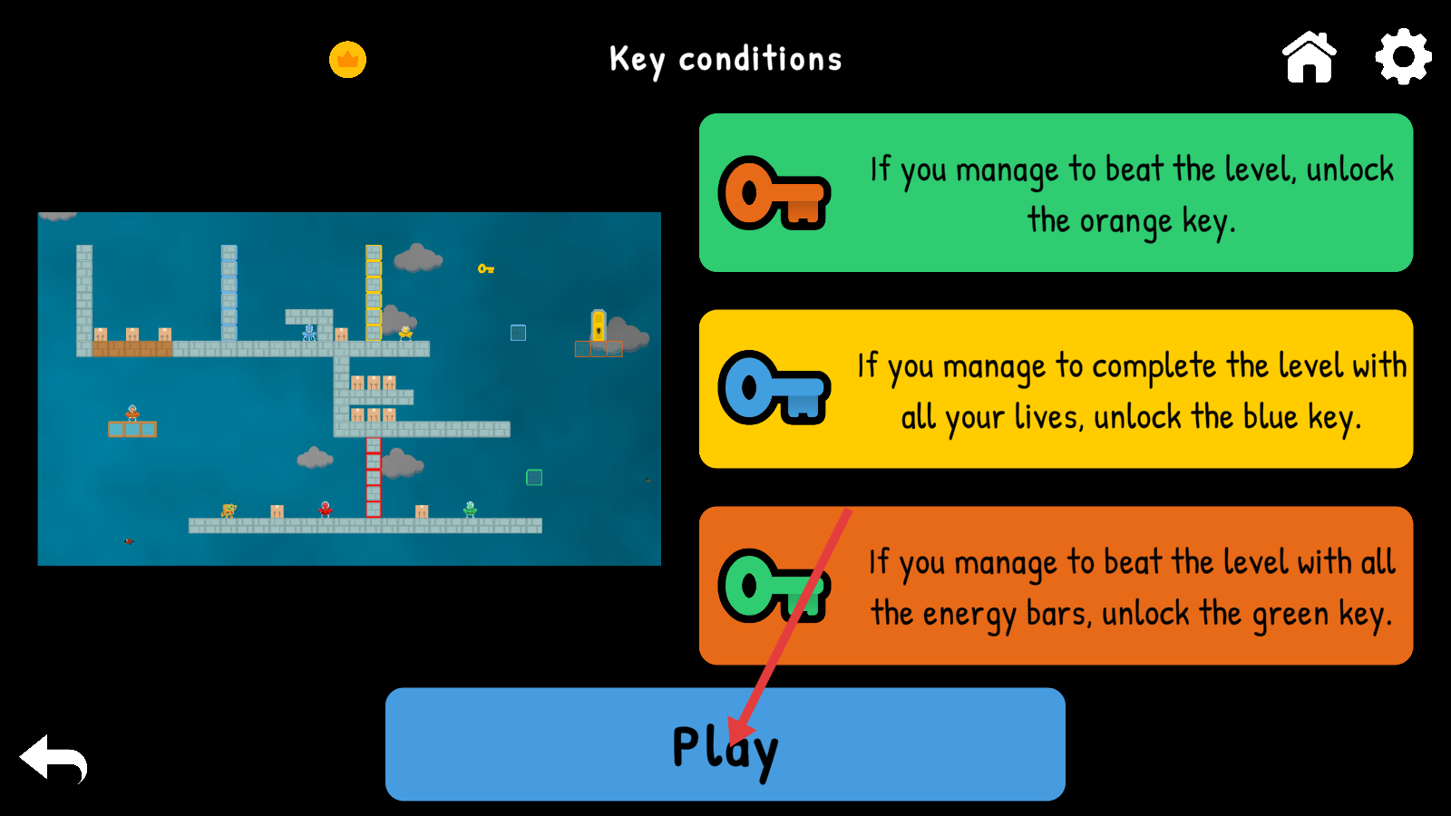1、点击【Play】进入教程关(Tutorial),了解橙色(通关)、蓝色(满血通关)、绿色(满能量通关)钥匙获取规则。