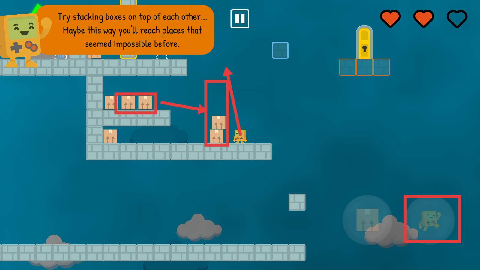 3、将多个箱子堆叠,搭建登高路径,突破地形障碍,遵循教程提示尝试高难度区域。