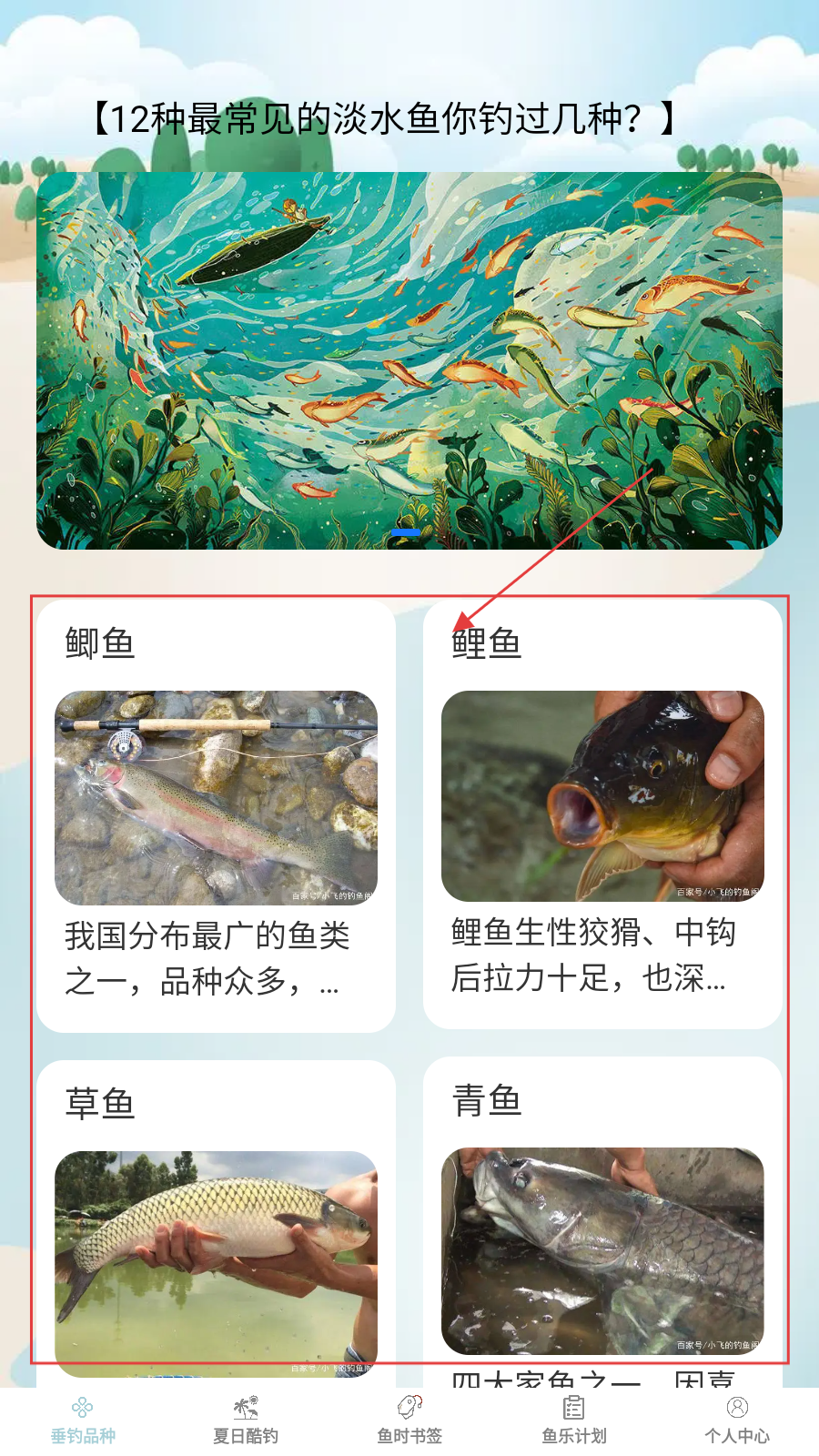 1、进入垂钓品种页,浏览【鲫鱼】【鲤鱼】等12种淡水鱼,了解分布、习性等信息。