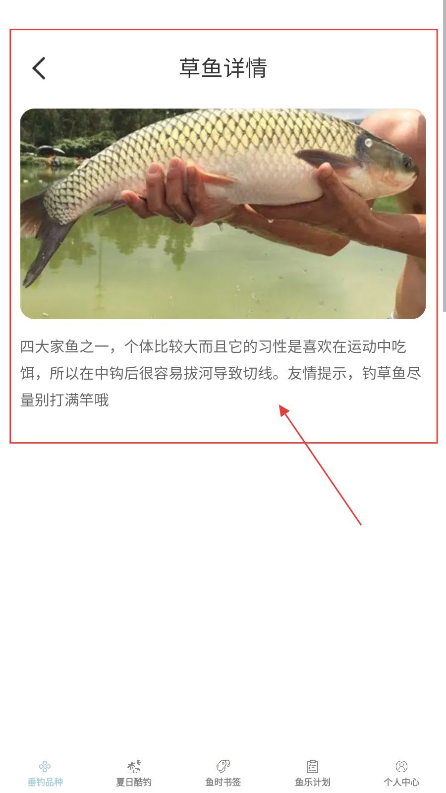 2、查看【草鱼】详情,记其喜运动中吃饵、中钩易切线,钓时别打满竿。