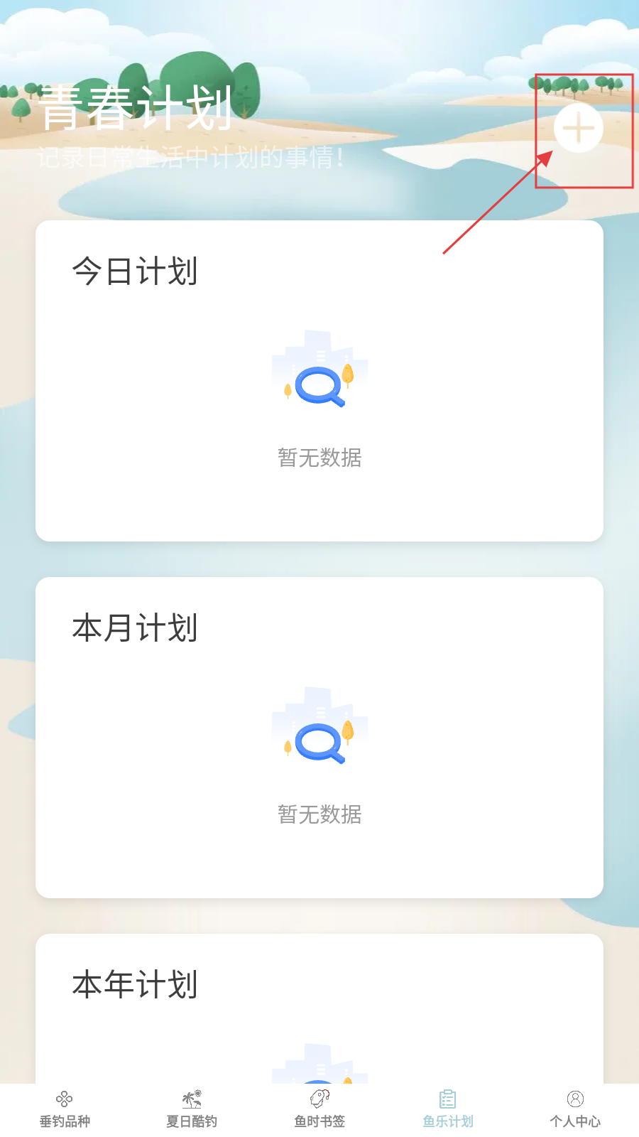 3、切鱼乐计划页,点右上角【+】,开启添加钓鱼计划流程。