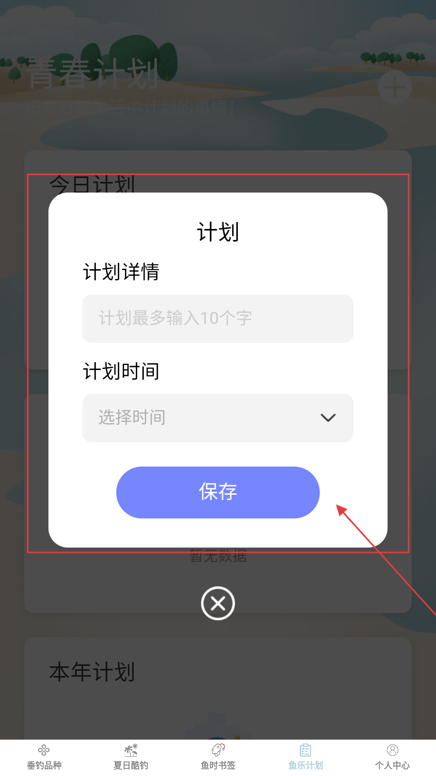 4、填计划详情(限10字内)、选时间,点【保存】记录钓鱼计划。