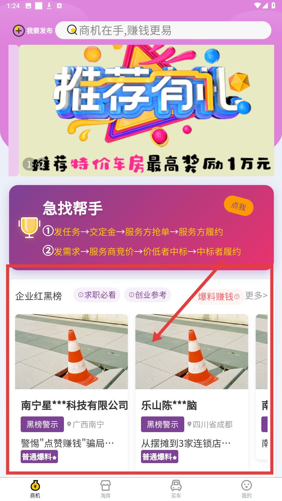 1、进入商机页,浏览【企业红黑榜】,参考求职创业信息,参与【推荐有礼】赚奖励。