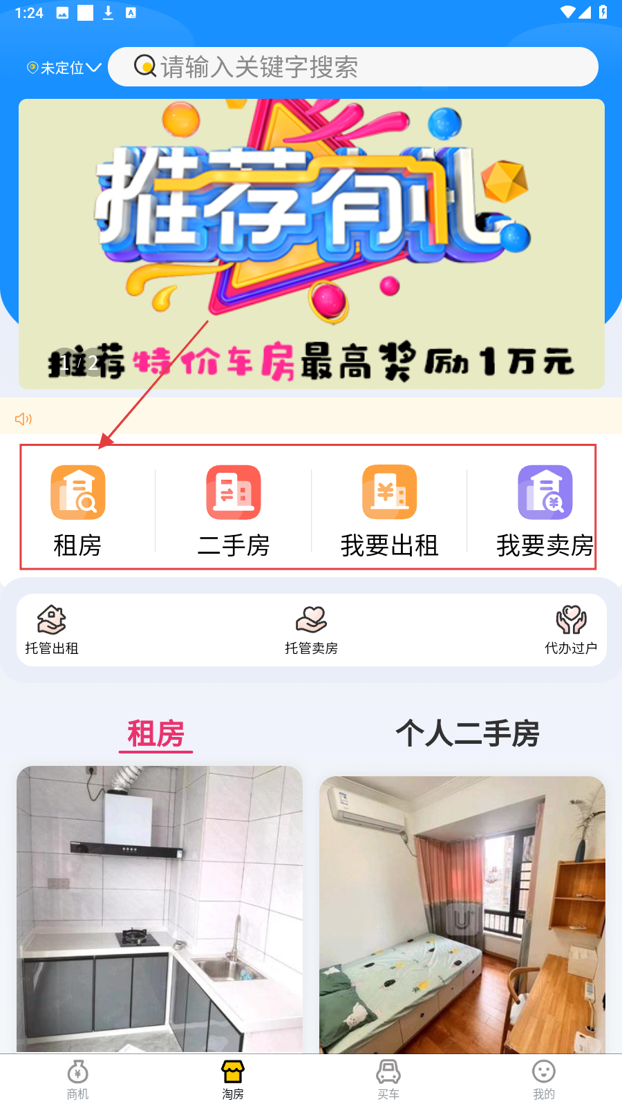 2、切换淘房页,选【租房】或【二手房】,按需找心仪房源或发布需求。