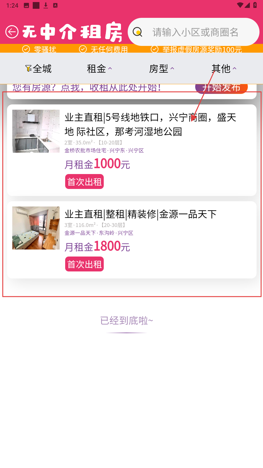 3、在无中介租房,用【租金】【房型】筛选项,定位匹配房源信息。