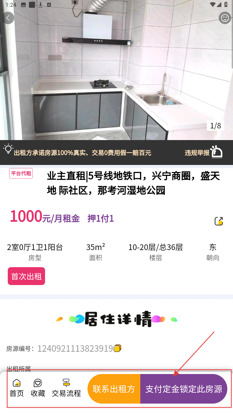 4、点进房源详情,查户型价格,点【联系出租方】或【支付定金锁定此房源】。