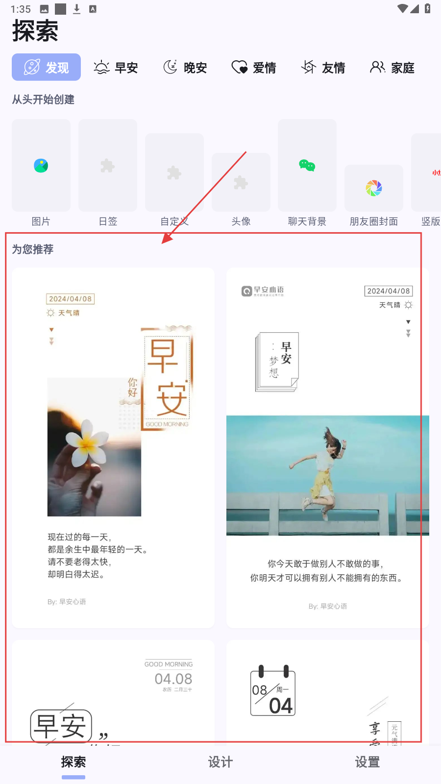 1、进入探索页,选【为您推荐】早安图文,开始日签创作。