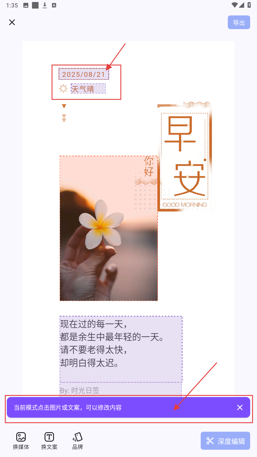 2、点选图文,修改日期【2025/08/21】天气等信息,定制内容。