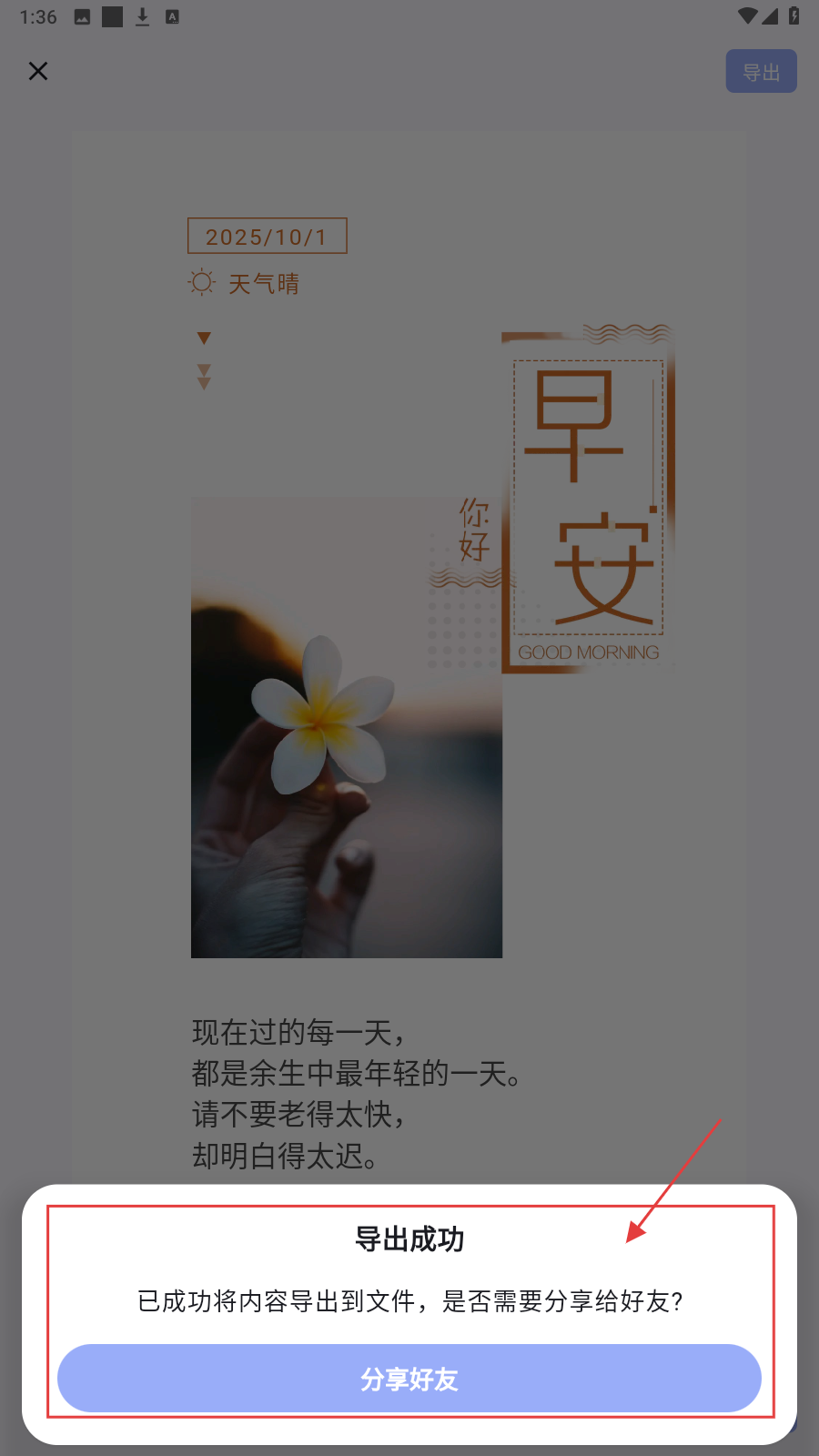 4、导出成功后,按需选【分享好友】,完成日签分享。