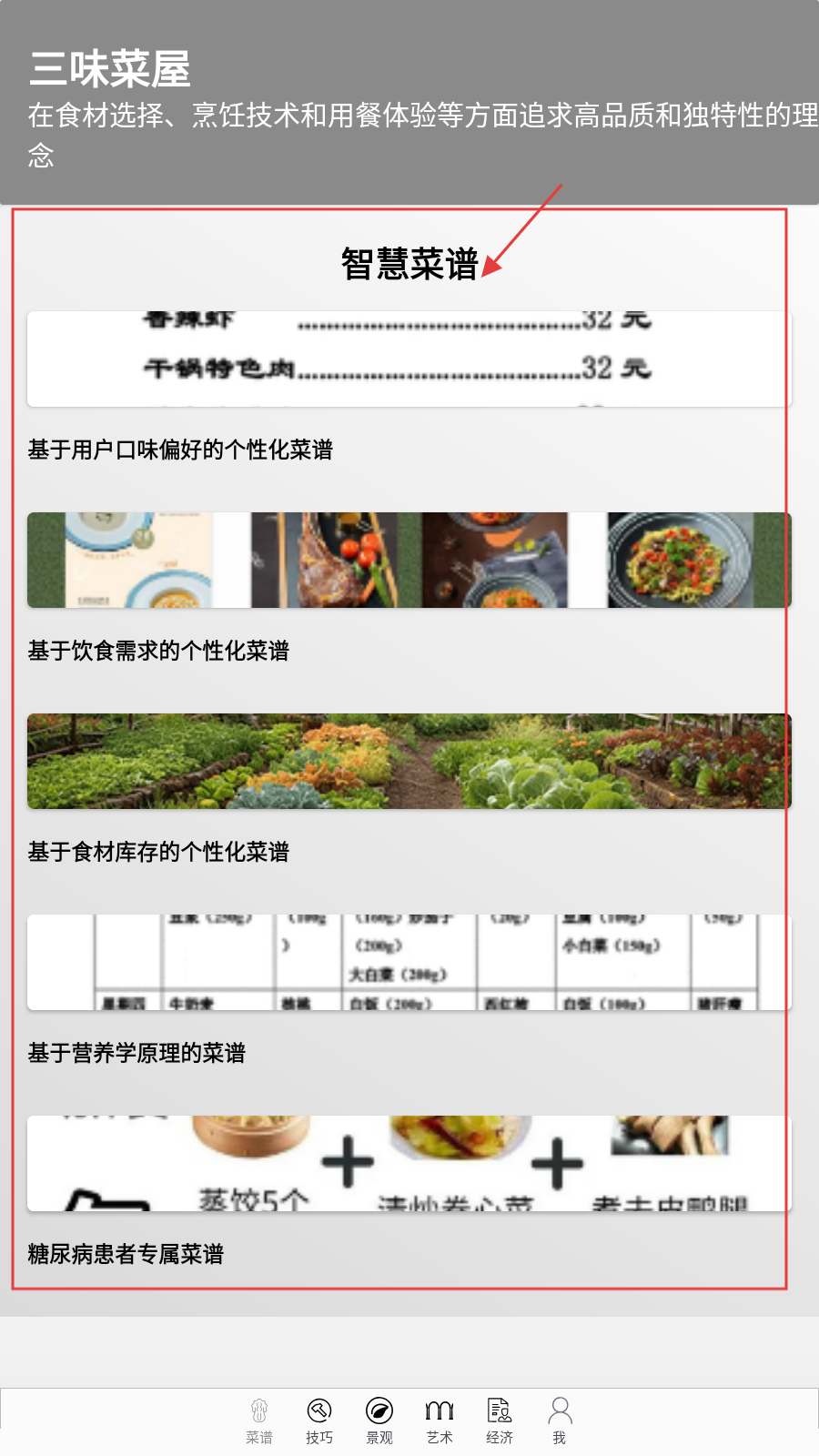 1、进入三味菜屋,浏览【智慧菜谱】分类,选感兴趣的个性化菜谱。