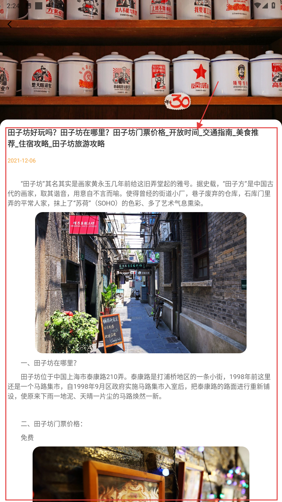 3、查看景点详情,像【田子坊】,了解位置-门票-开放时间等内容做行程。