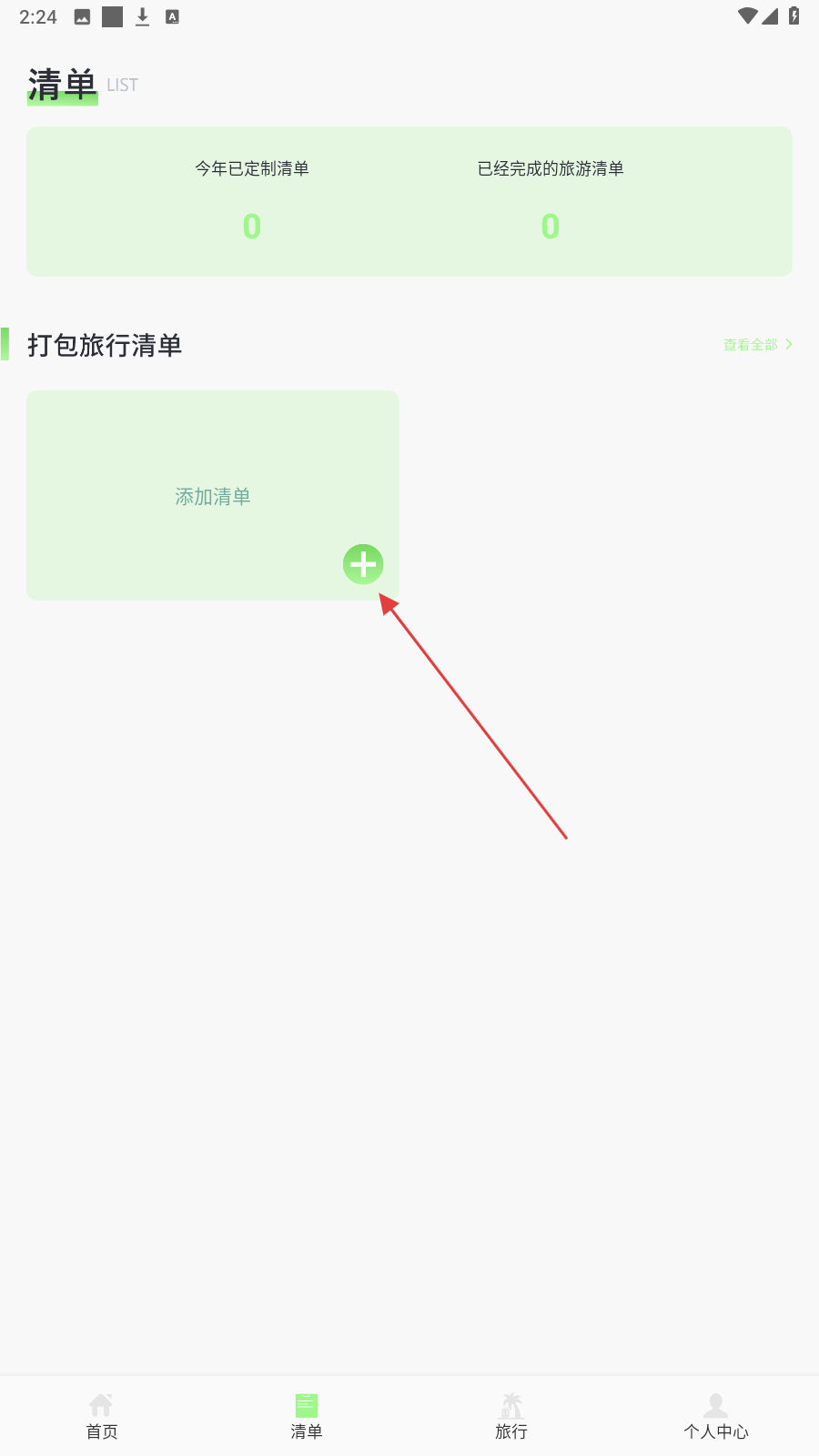 4、在【清单】页,点绿色【+】,添加打包旅行清单,规划旅途物品。