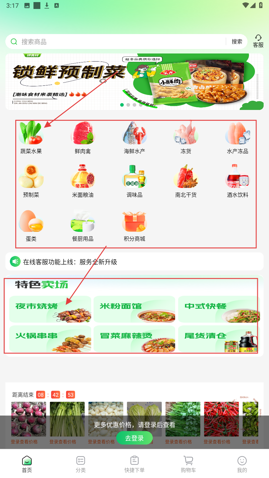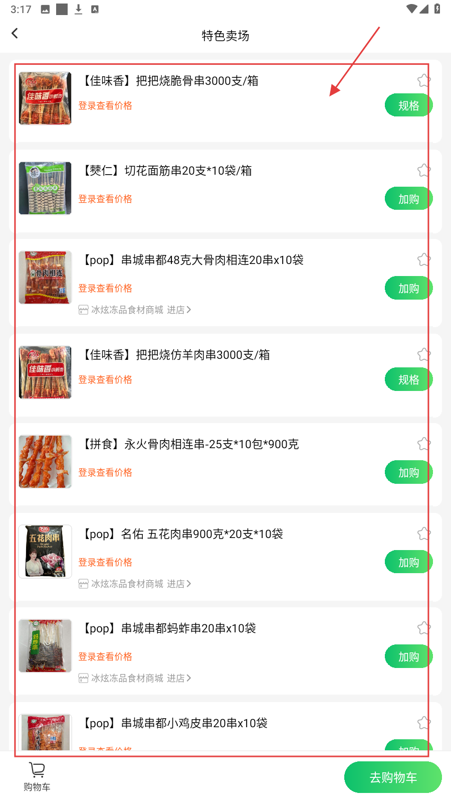 4、进入【特色卖场】选烤串等,点【去购物车】统一结算下单。