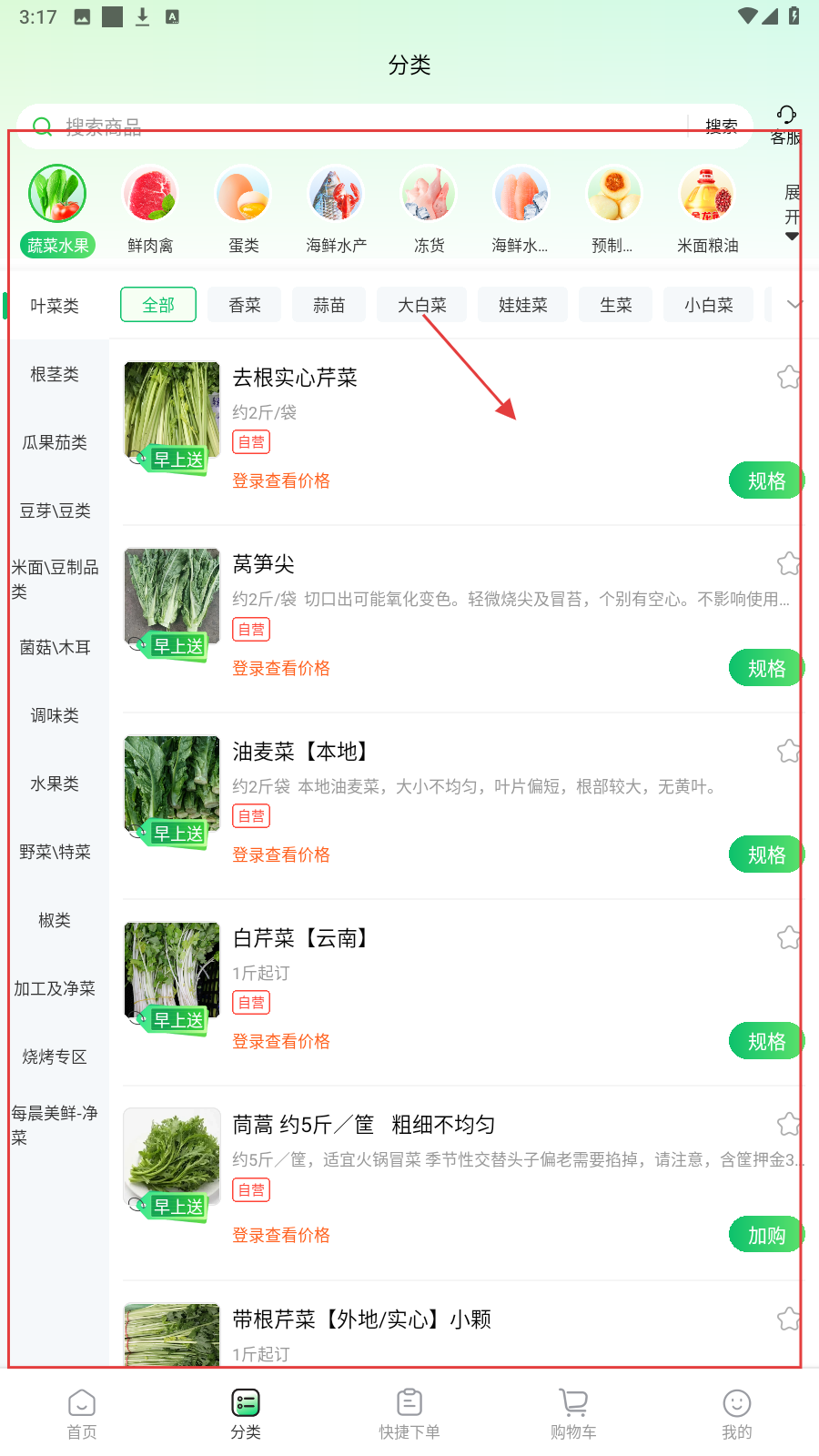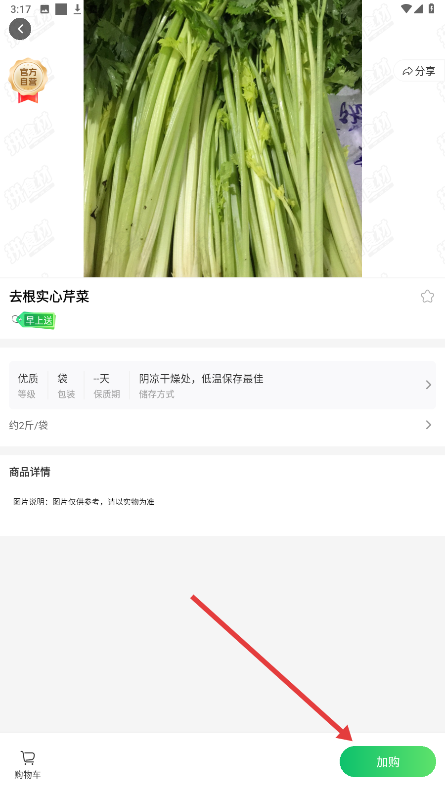 2、在分类页面,筛选具体商品,如【去根实心芹菜】,查看详情信息。